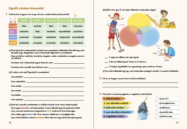 A feladatok magukkal ragadják a gyerekeket. A vidám, gyermekközeli illusztrációk szintén a jókedvű munkavégzés örömét erősítik.